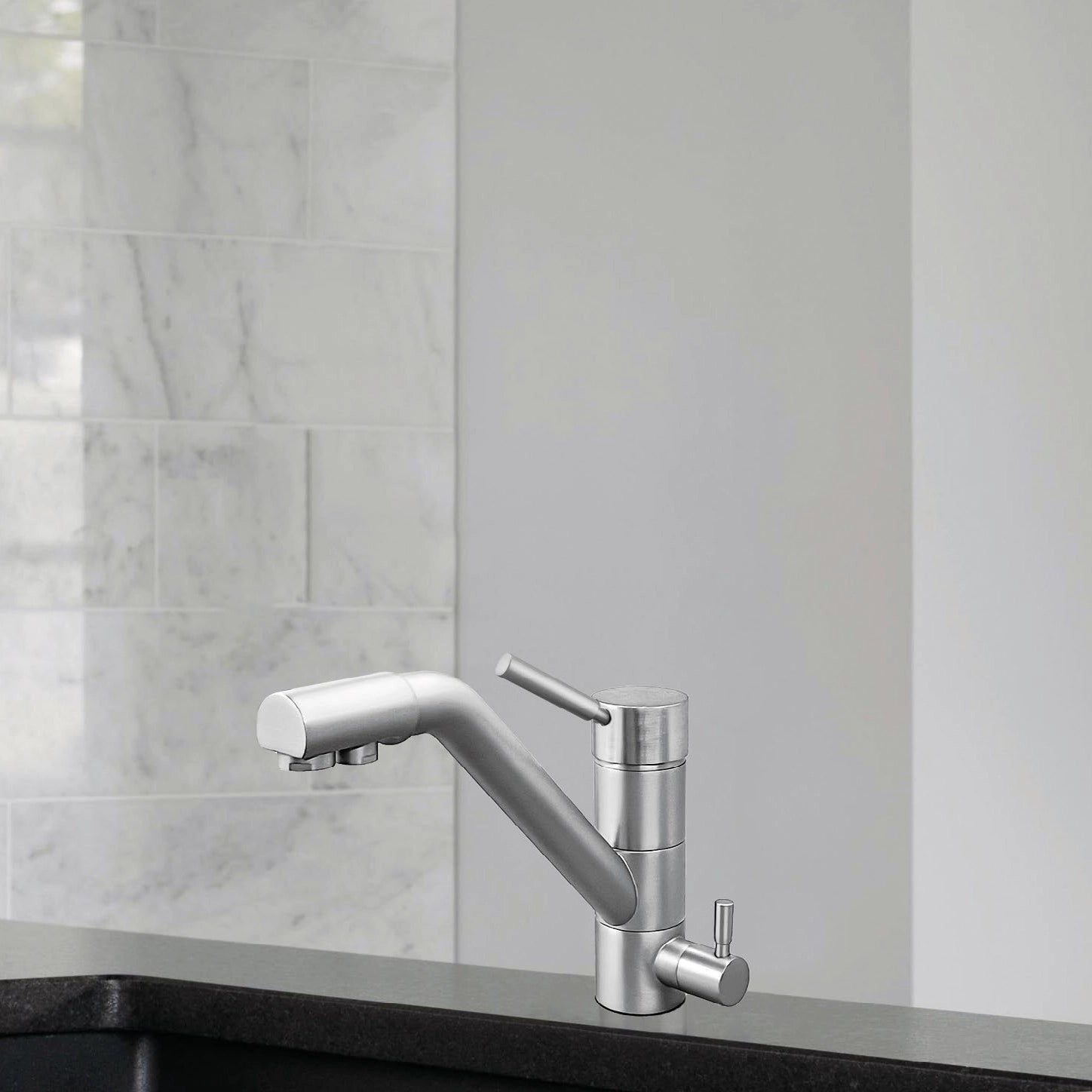 Ein speziell konzipierter Wasserhahn sorgt dafür, dass das hochwertige, gefilterte Wasser nicht mit dem unbehandelten Leitungswasser in Berührung kommt. Dadurch bleibt die Wasserqualität erhalten. Zudem bieten verschiedene Modelle die Möglichkeit, sowohl gefiltertes als auch normales Hauswasser komfortabel zu nutzen. Dies ermöglicht eine praktische Handhabung im Alltag, ohne den hohen Reinheitsgrad des Evodrop-Wassers zu beeinträchtigen.