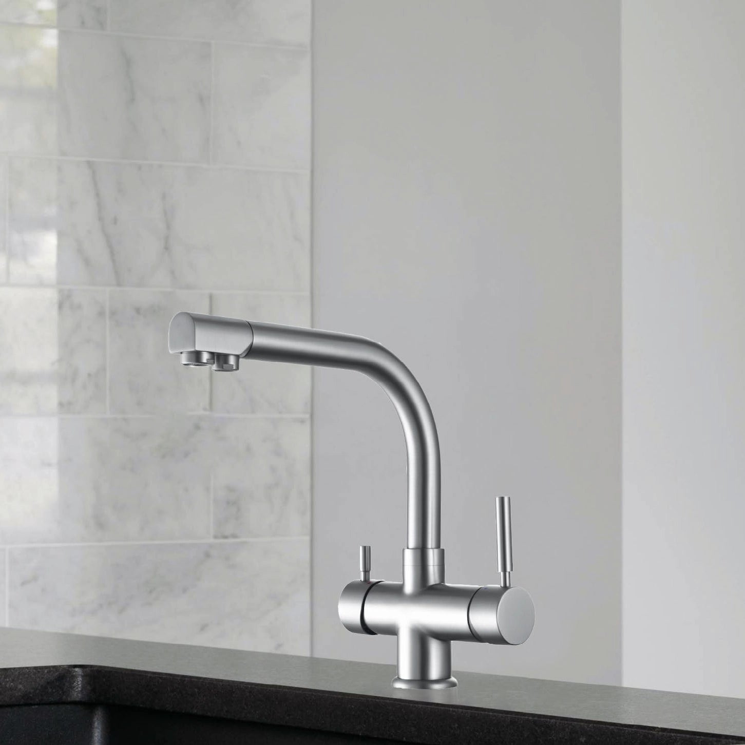 Dieser elegante Kombi-Wasserhahn ist mit dynamischen Funktionen ausge-stattet. Über den grossen Hebel (rechts) können Sie das normale Gebrauchs-wasser verwenden und mit dem linken Hebel haben Sie die Möglichkeit zwischen dem aufbereiteten Evodrop-Wasser ohne Wasserstoff oder eben mit Wasserstoff zu wählen.